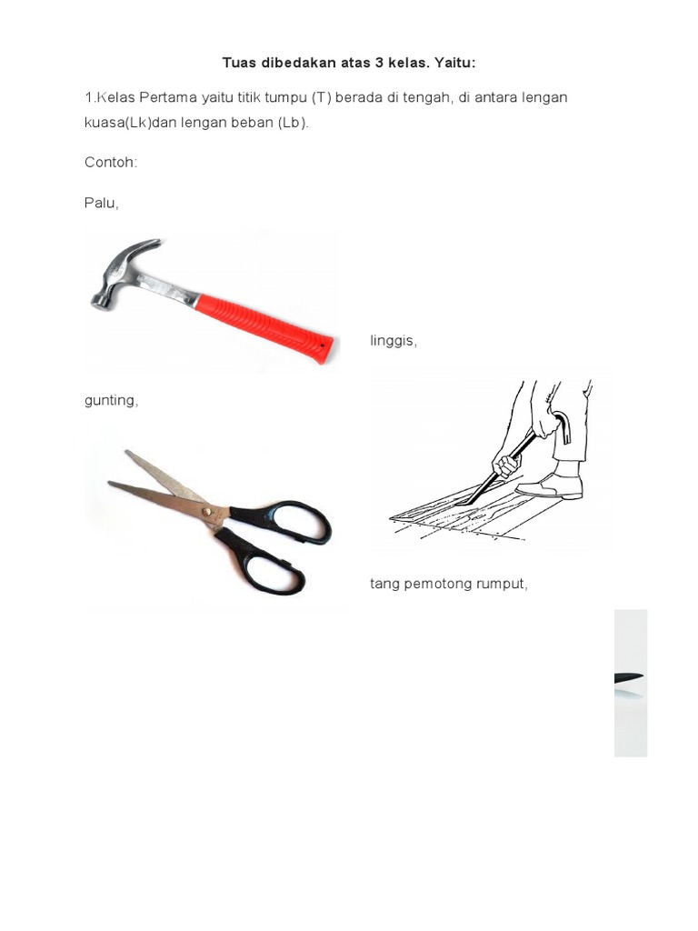 Pengungkit jenis pertama Contoh. Contoh alat yang termasuk ke dalam tuas jenis. Ketika lengan beban tuas lebih.